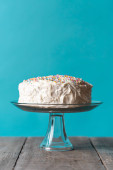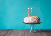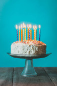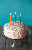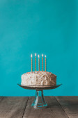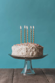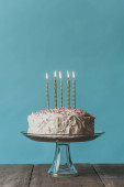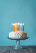 Urodzinowe ciasto z białym lukrem i świece na niebieskim tle.