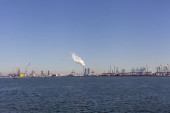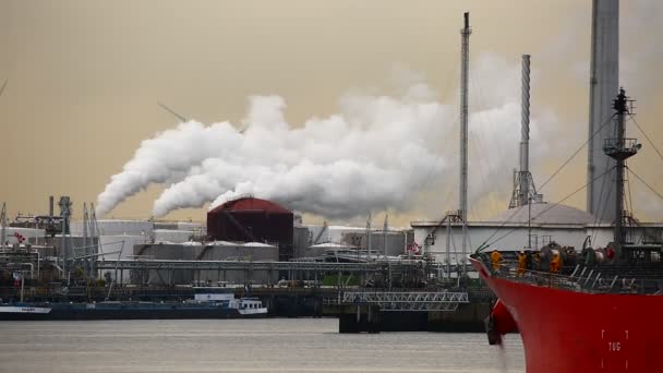 Przemysłowy terminal naftowy i elektrownie emitujące dym i parę wodną, obszar przemysłu portowego Rotterdamu