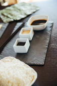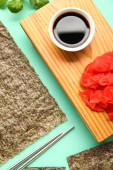 Płyta z arkuszy nori, ryż, wasabi i sos sojowy na żółtym tle