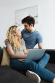 beztroska międzyrasowa para w białych koszulkach ogląda film na laptopie w sypialni w domu