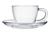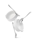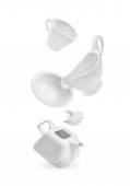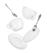 Zestaw filiżanek kawy ze srebrną łyżeczką na na białym tle backgrou