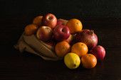 "Dzień Ziemi i recykling odpadów". Czerwony granat w brązowej torbie wielokrotnego użytku na owoce i warzywa