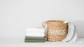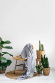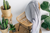 zbliżenie poduszek w nakryciu tekstylnym na krześle rattanowym na białym tle z przestrzenią do kopiowania, element dekoracji bohemy