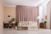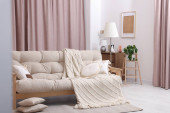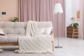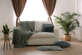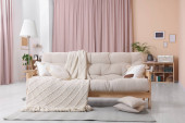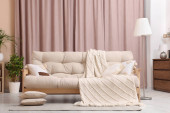Wygodna sofa, poduszki i koc w przytulnym pokoju. Projekt wnętrza