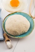 Gotowanie bułeczek z wodą sodową. Ciasto i składniki na białym drewnianym stole