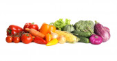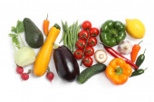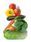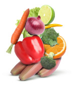 Wiele świeżych warzyw i owoców spadających na białe tło