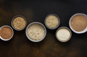 Zdjęcie "Różne zboża w miski baner, widok z góry na brązowym tle z miski zbóż i uszu owsa" może być wykorzystywane do celów osobistych i komercyjnych zgodnie z warunkami zakupionej licencji Royalty-free. Obraz jest dostępny do pobrania w jakości wysokiej rozdzielczości do 5760x3840.