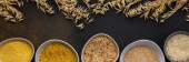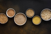 Różne zboża w miski baner, widok z góry na brązowym tle z miski zbóż i uszu owsa
