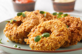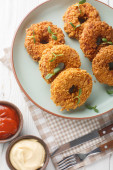 Pieczone pączki z kurczaka zrobione z wyciągniętego kurczaka z warzywami i smażone z bliska na talerzu. Poziomy widok z góry z góry