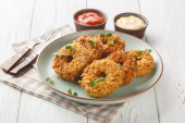 Zdjęcie "Pieczone pączki z kurczaka zrobione z wyciągniętego kurczaka z warzywami i smażone z bliska na talerzu. Poziomy widok z góry z góry" może być wykorzystywane do celów osobistych i komercyjnych zgodnie z warunkami zakupionej licencji Royalty-free. Obraz jest dostępny do pobrania w jakości wysokiej rozdzielczości do 5760x3840.