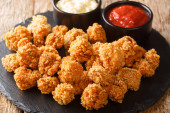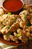 Pieczone pączki z kurczaka zrobione z wyciągniętego kurczaka z warzywami i smażone z bliska na talerzu. Horyzonta