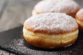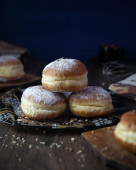 Berliner pączki w cukrze pudru z kwiatami jaśminu na szarym tle