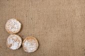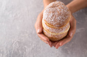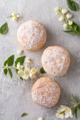Ruddy pyszne pączki berliners z nadzieniem posypane cukrem pudrem na białym talerzu na szarym tle