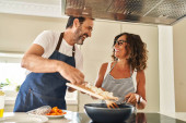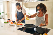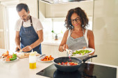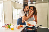 Latynoska para w średnim wieku uśmiechnięta pewna siebie wylewająca jedzenie na patelnię w kuchni