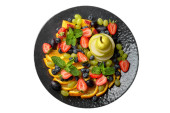 Wegetariańska sałatka Panzanella z pomidorami, cebulą i grzankami chlebowymi. Izolacja na białym tle