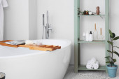 Zdjęcie "Stylowa biała wanna w łazience. Projekt wnętrza" może być wykorzystywane do celów osobistych i komercyjnych zgodnie z warunkami zakupionej licencji Royalty-free. Obraz jest dostępny do pobrania w jakości wysokiej rozdzielczości do 5760x3840.