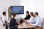 Zdjęcie "Bizneswoman pokazuje wykresy na ekranie telewizora w biurze" może być wykorzystywane do celów osobistych i komercyjnych zgodnie z warunkami zakupionej licencji Royalty-free. Obraz jest dostępny do pobrania w jakości wysokiej rozdzielczości do 5760x3840.