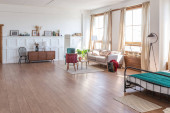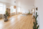 Zdjęcie "wnętrze stylowego poddasza. przestronny apartament z dużymi oknami, parkiet na podłodze i lekkie ściany. widok z bliska półki z różnych małych rzeczy do dekoracji" może być wykorzystywane do celów osobistych i komercyjnych zgodnie z warunkami zakupionej licencji Royalty-free. Obraz jest dostępny do pobrania w jakości wysokiej rozdzielczości do 5760x3840.