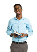 Szczęśliwy Afryki amerykański student stojący z laptopa i
