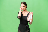 Młoda kaukaska kobieta ćwicząca balet na odosobnionym tle z zamiarem urzeczywistnienia rozwiązania podnosząc palec w górę