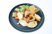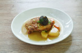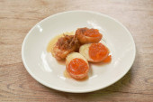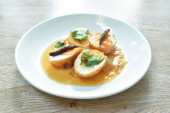 gotowane pół krojone jajko z tofu w ziołowej zupie brązowej i nogi wieprzowej na talerzu