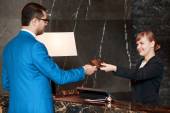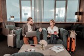 Ładna para melduje się w recepcji w luksusowym hotelu, małżonkowie w ubraniach podróżniczych