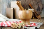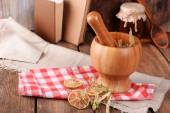Drewniane naczynia ze szkła butelce oliwy z oliwek na tle desek