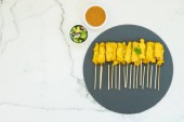 Kurczak tikka boti kabab, kebab serwowane w danie izolowane na drewnianym stole widok z góry indyjskich przypraw żywności
