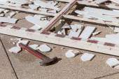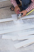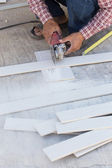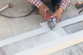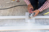 mężczyzna robotnik naprawy ogrodzenia stalowe z elektryczna Piła narzędzie