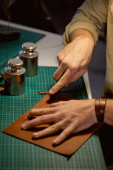Proces szycia skórzanego pasa. Mans ręce za szyciem. Warsztaty skórzane.Wykonanie brązowego ręcznie robionego skórzanego portfela. Szyję portfel. Piercer wybija dziury w kawałku skóry.