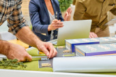 Młoda ruda dziewczyna i przystojny mężczyzna sprawdzają jakość kawałka skóry w studio. zbliżenie widok z boku strzał