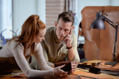 Zdjęcie "Młoda ruda dziewczyna i przystojny mężczyzna sprawdzają jakość kawałka skóry w studio. zbliżenie widok z boku strzał" może być wykorzystywane do celów osobistych i komercyjnych zgodnie z warunkami zakupionej licencji Royalty-free. Obraz jest dostępny do pobrania w jakości wysokiej rozdzielczości do 5760x3840.