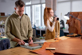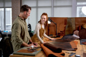 młodzi, ambitni, aktywni ludzie wybierający najlepszą skórę do robienia portfeli, portret z bliska, rzemieślnik tworzą plan, jak zaprojektować Brenda
