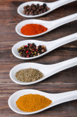 Różnego rodzaju przypraw w łyżki ceramiki, na tle worze