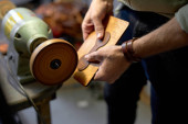 wykwalifikowana kobieta krawiec rozpakowywanie rolki skóry na stole w warsztacie w domu.Close przycięty widok z boku strzał