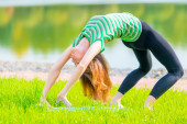 Portret Urocza dziewczyna w zielony t-shirt na trawie
