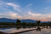 Zdjęcie "Pole ryżowe, padi, podczas zachodu słońca w północnej Tajlandii. Wysokiej jakości zdjęcie" może być wykorzystywane do celów osobistych i komercyjnych zgodnie z warunkami zakupionej licencji Royalty-free. Obraz jest dostępny do pobrania w jakości wysokiej rozdzielczości do 5760x3840.