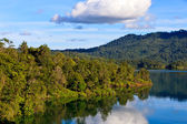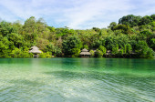 Mała wioska w zielonym lesie w Parku Narodowym Khao Sok, Tajlandia. Błękitne jezioro i długa łódź, błękitne niebo. Wysokiej jakości zdjęcie