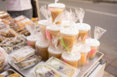 Kolak pisang ubi, singkong dan kolang kaling, pacar cina, biji salak lub candil, menu buka puasa (Iftar żywności, banan, słodkie ziemniaki, cassava i kolang-kaling w zupie z mleka kokosowego cukru palmowego).