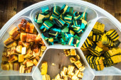 Zdjęcie "Kue lupis - indonezyjska słodka przekąska z kleistego ryżu, tarty kokos z cukrem palmowym. Jedzenie Iftar (menu berbuka puasa)." może być wykorzystywane do celów osobistych i komercyjnych zgodnie z warunkami zakupionej licencji Royalty-free. Obraz jest dostępny do pobrania w jakości wysokiej rozdzielczości do 5760x3840.