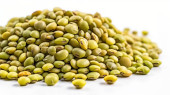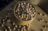 Drewniana miska soi fasola albo soja drewniane tło kopia przestrzeń studio prezentacja płaska układanka.