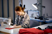 Zdjęcie "skoncentrowana blond biała kobieta krawcowa siedzi przy użyciu nowoczesnej maszyny do szycia. Dressmaker pracuje w warsztacie tekstylnym. Krawiectwo, szycie jako mały biznes lub koncepcja hobby. proces szycia" może być wykorzystywane do celów osobistych i komercyjnych zgodnie z warunkami zakupionej licencji Royalty-free. Obraz jest dostępny do pobrania w jakości wysokiej rozdzielczości do 5760x3840.