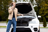 Poważny człowiek robiący diagnostyczne auto, stojący przy otwartym kapturze, rozmawiający przez telefon komórkowy. Naprawa samochodów, koncepcja
