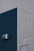 Światło słoneczne i cień na powierzchni nowoczesnej białej i szarej falistej budynku fabryki metalu ze stalowym ogrodzeniem na dachu w perspektywie widok z boku