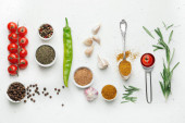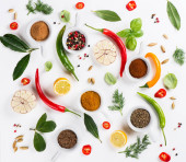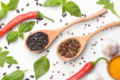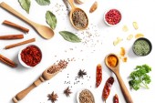 Skład z drewnianą miską pieprzu, ziół i przypraw na białym tle