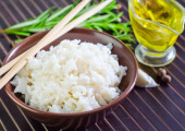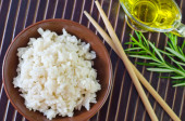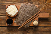 Płyta z gotowanym ryżem, octem, arkuszami nori i pałeczkami na jasnodrewnianym tle