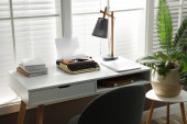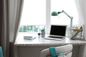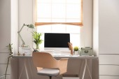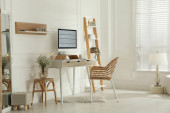 Cozy workspace with modern laptop on desk and comfortable chair at home