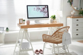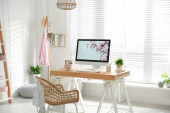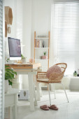 Cozy workspace with modern laptop on desk and comfortable chair at home