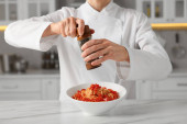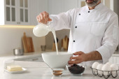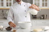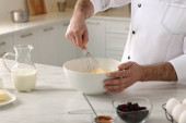 Zdjęcie "Profesjonalny kucharz pieczenia ciasta na białym marmurowym stole w pomieszczeniach, zbliżenie" może być wykorzystywane do celów osobistych i komercyjnych zgodnie z warunkami zakupionej licencji Royalty-free. Obraz jest dostępny do pobrania w jakości wysokiej rozdzielczości do 5760x3840.