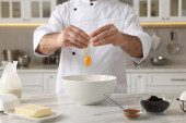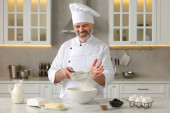 Profesjonalny kucharz pieczenia ciasta na białym marmurowym stole w pomieszczeniach, zbliżenie